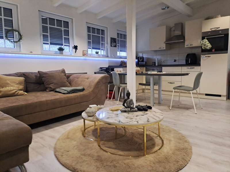 Die Wohnung wurde im Jahr 2023 umfassend saniert und überzeugt durch eine durchdachte Raumaufteilung sowie eine hochwertige Ausstattung. Herzstück ist das großzügige, offen gestaltete Wohnzimmer mit integrierter Einbauküche, das ein modernes und luftiges Wohngefühl vermittelt.