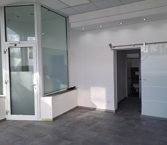 Der großzügige Raum ist ideal geeignet für ein Büro. Der kleine Küchenbereich und das modern gestaltete WC, welches sogar mit einer Dusche ausgestattet ist, sind durch eine geschmackvolle, platzsparende Schiebetür aus Glas vom Hauptraum abgetrennt.