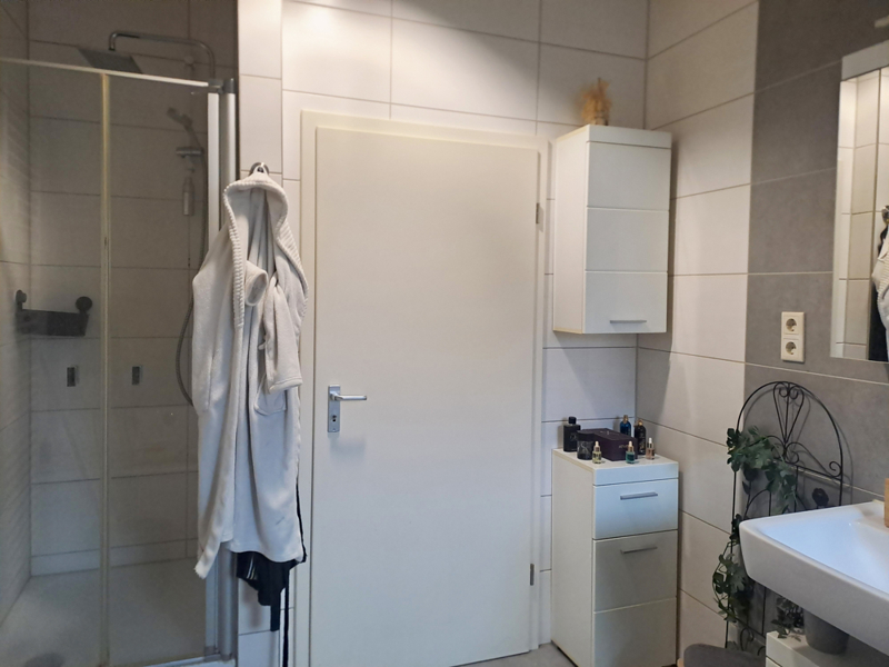 Das moderne Tageslichtbad ist hochwertig ausgestattet und verfügt sowohl über eine Badewanne als auch über eine Dusche. Stilvolle Badmöbel sind bereits vorhanden und verbleiben in der Wohnung. Die Waschmaschine befindet sich ebenfalls im Bad; zusätzlich steht ein gemeinschaftlicher Trockenkeller zum Aufhängen der Wäsche zur Verfügung.